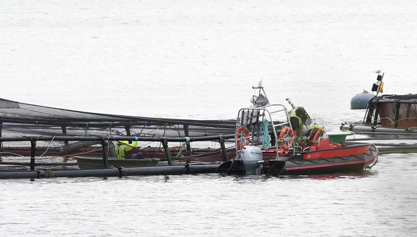 But when we filmed at The Scottish Salmon Company's Sgian Dubh salmon farm on 6 September 2020 most of the diseased salmon had been harvested out and the remaining large fish (which may have breached their biomass limits) were being kept alive via oxygen pumped into the cages.