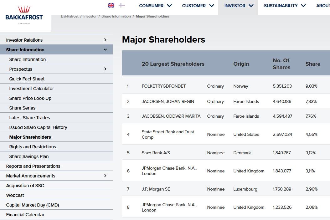 The largest shareholder in Bakkafrost is the Norwegian Government (as represented by Folketrygdfondet):