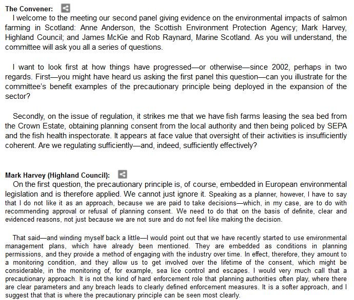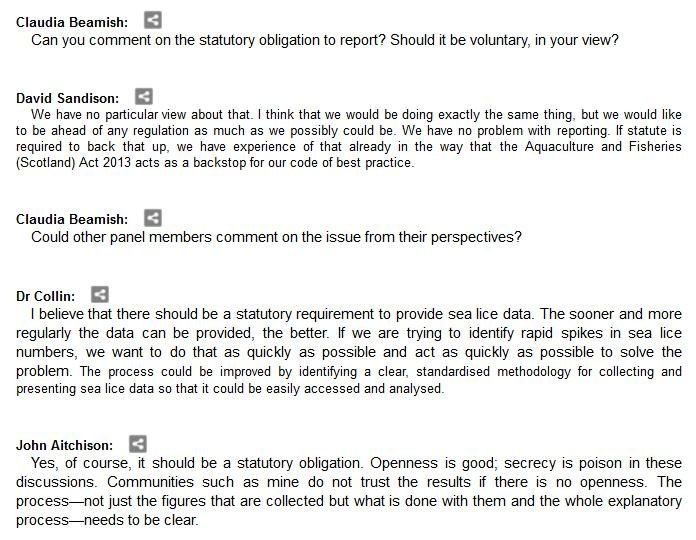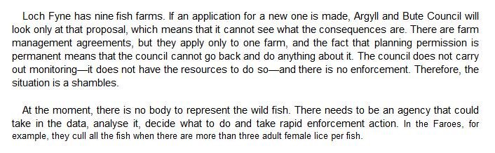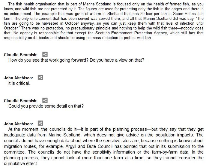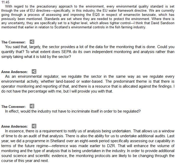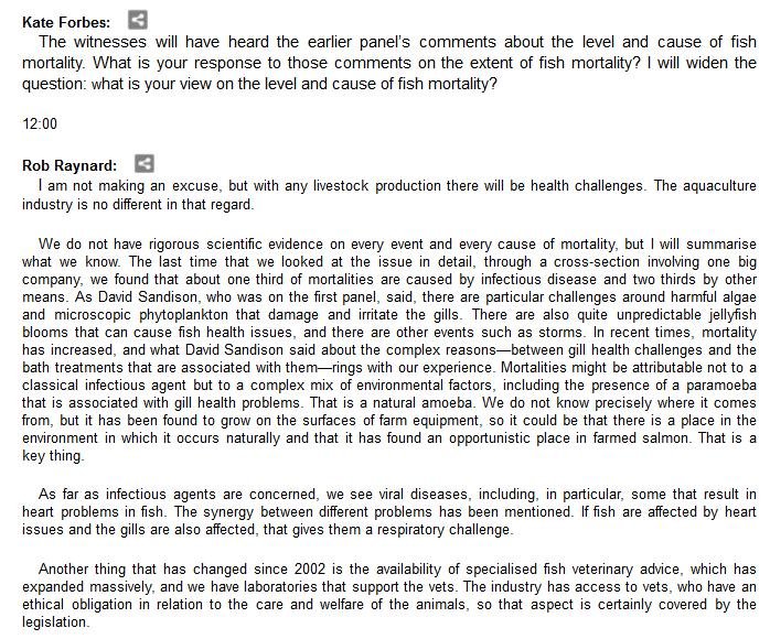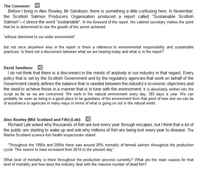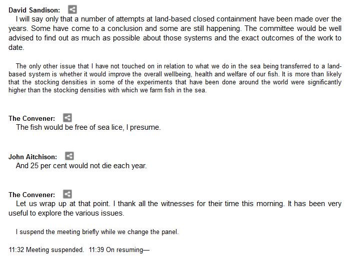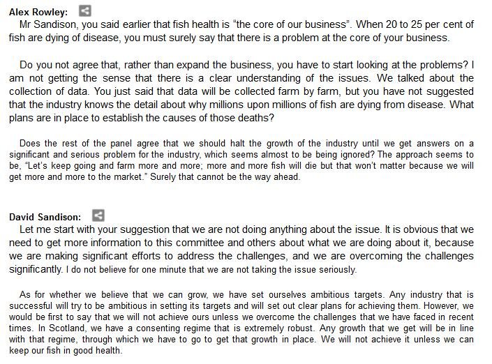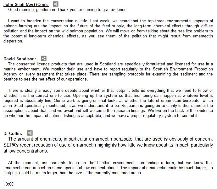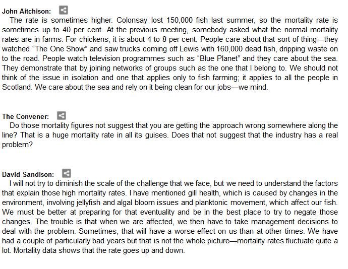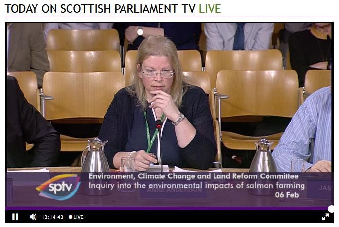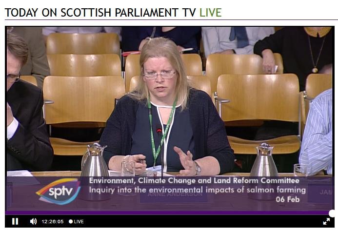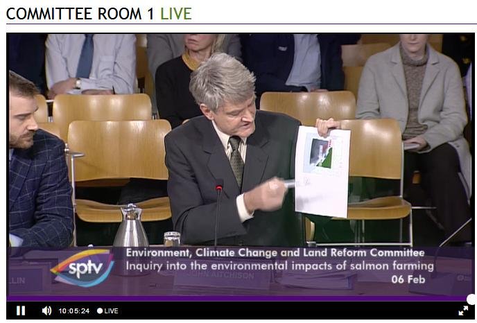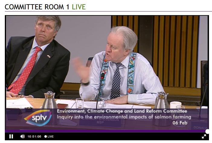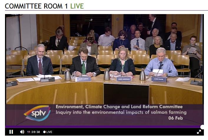The official transcript of the Scottish Parliament's inquiry into the environmental impacts of salmon farming on 6 February is now online here (and as a PDF online here)