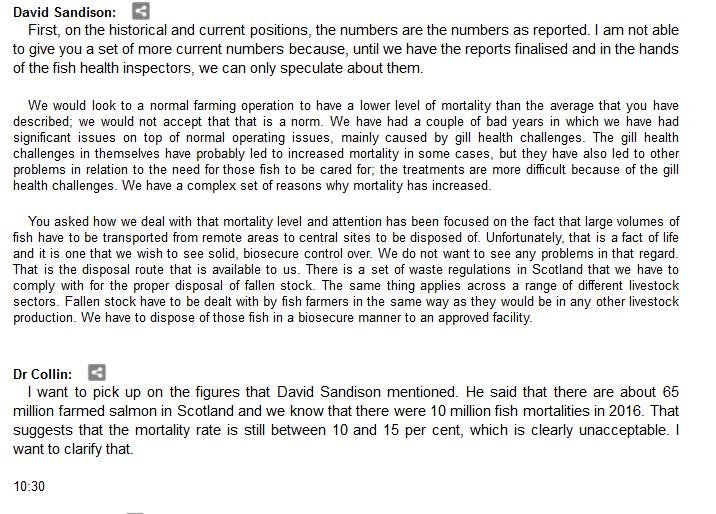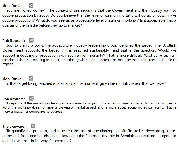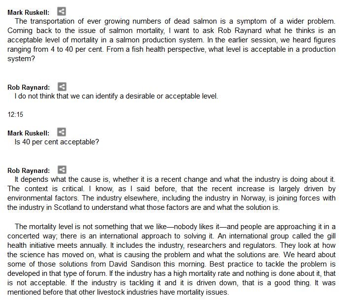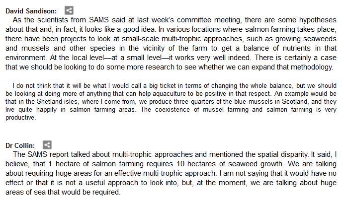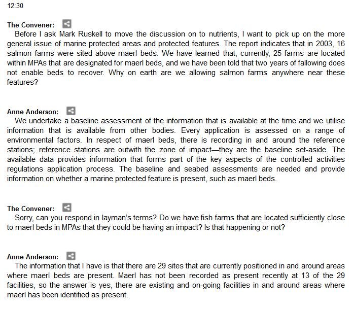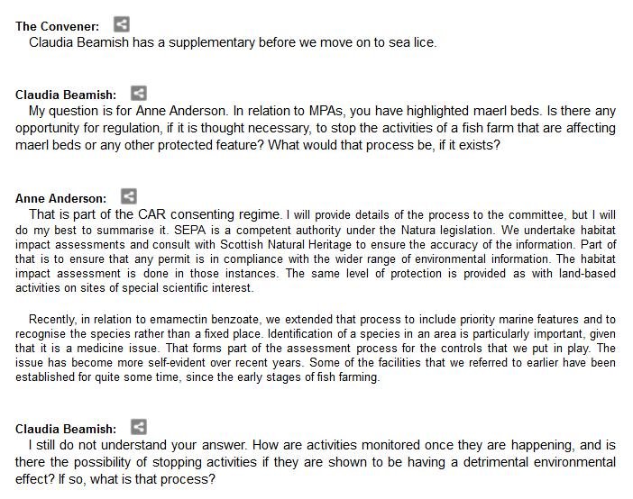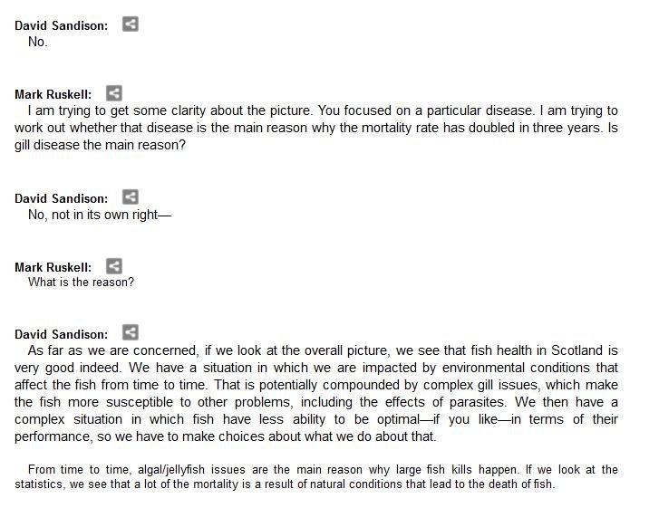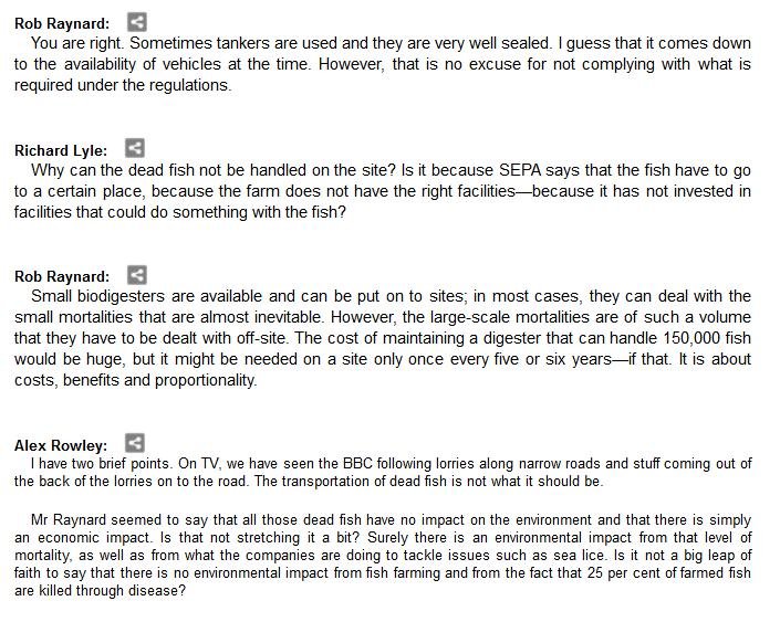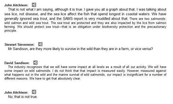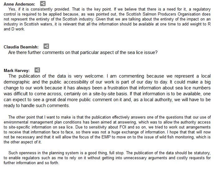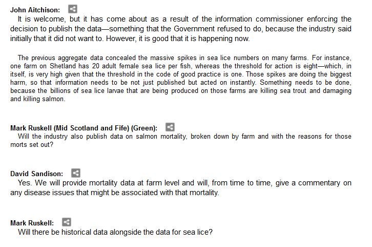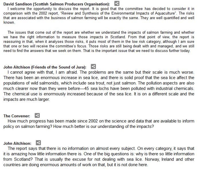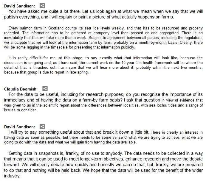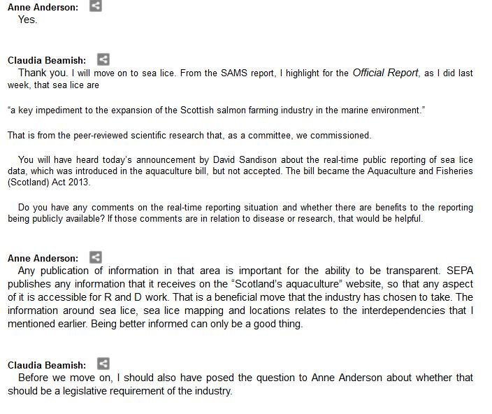 The official transcript of the Scottish Parliament's inquiry into the environmental impacts of salmon farming on 6 February is now online here (and as a PDF online here)