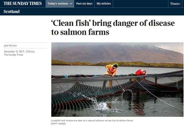 Read more via Sunday Times: "‘Clean fish’ bring danger of disease to salmon farms" and "Risk assessment of fish health associated with the use of cleaner fish in aquaculture"