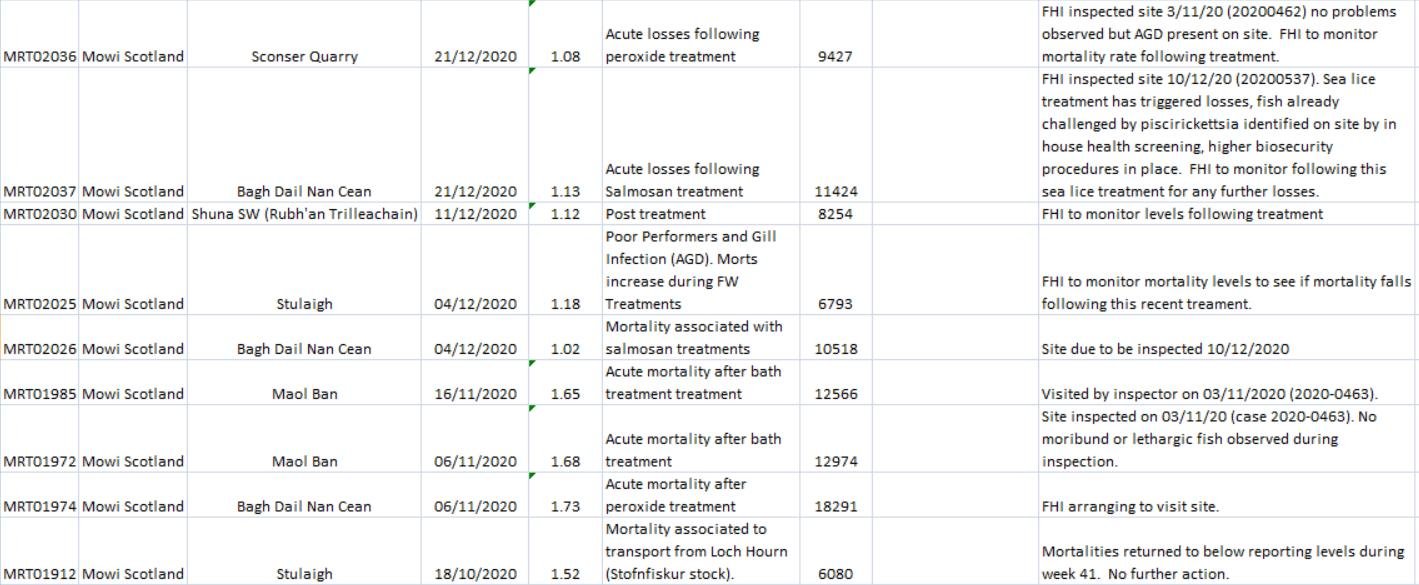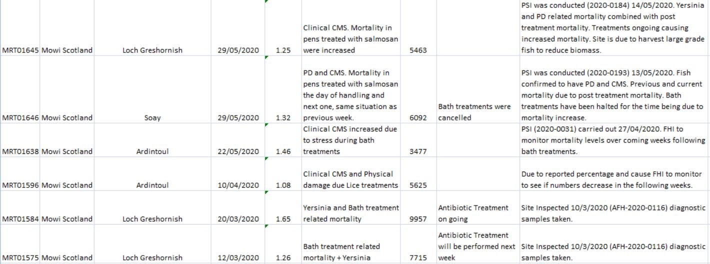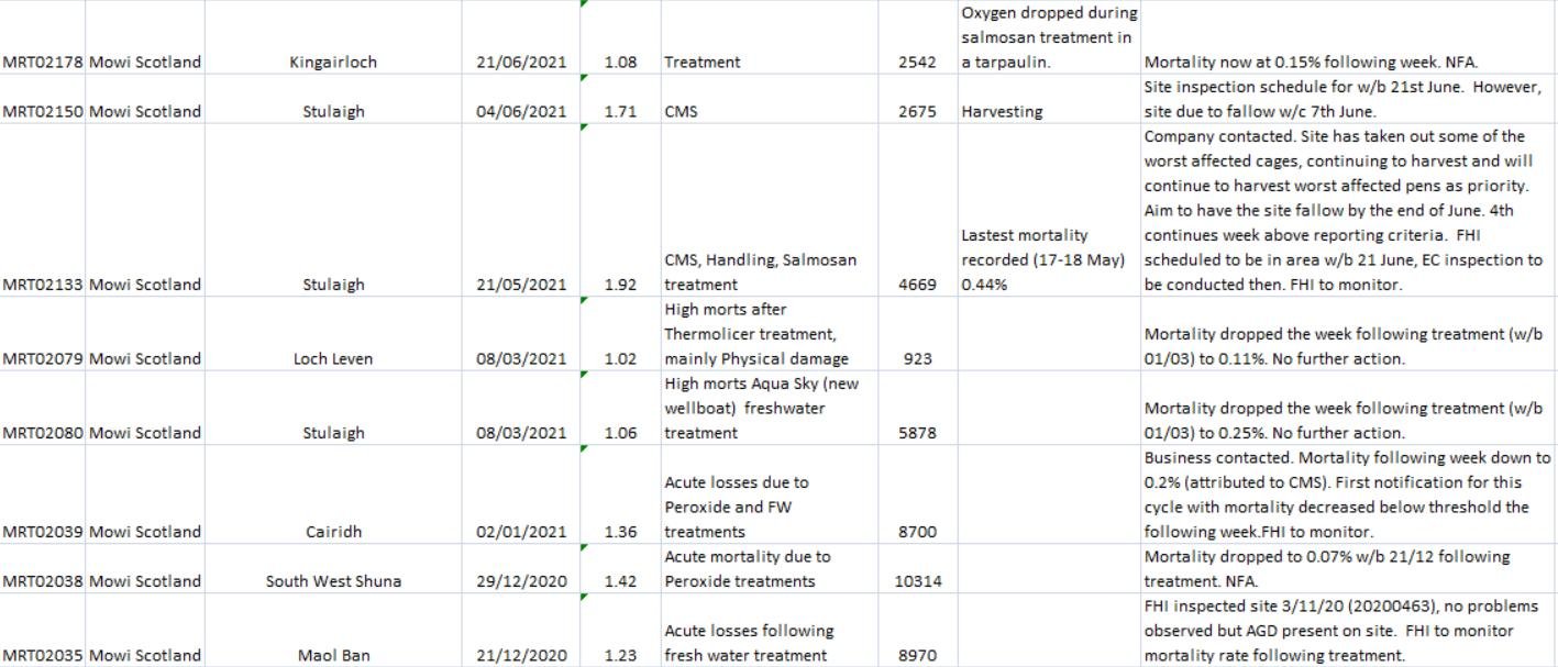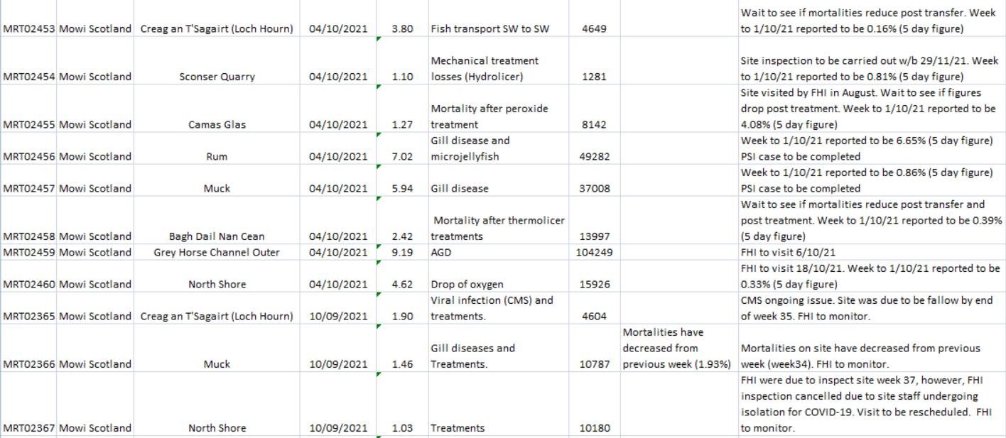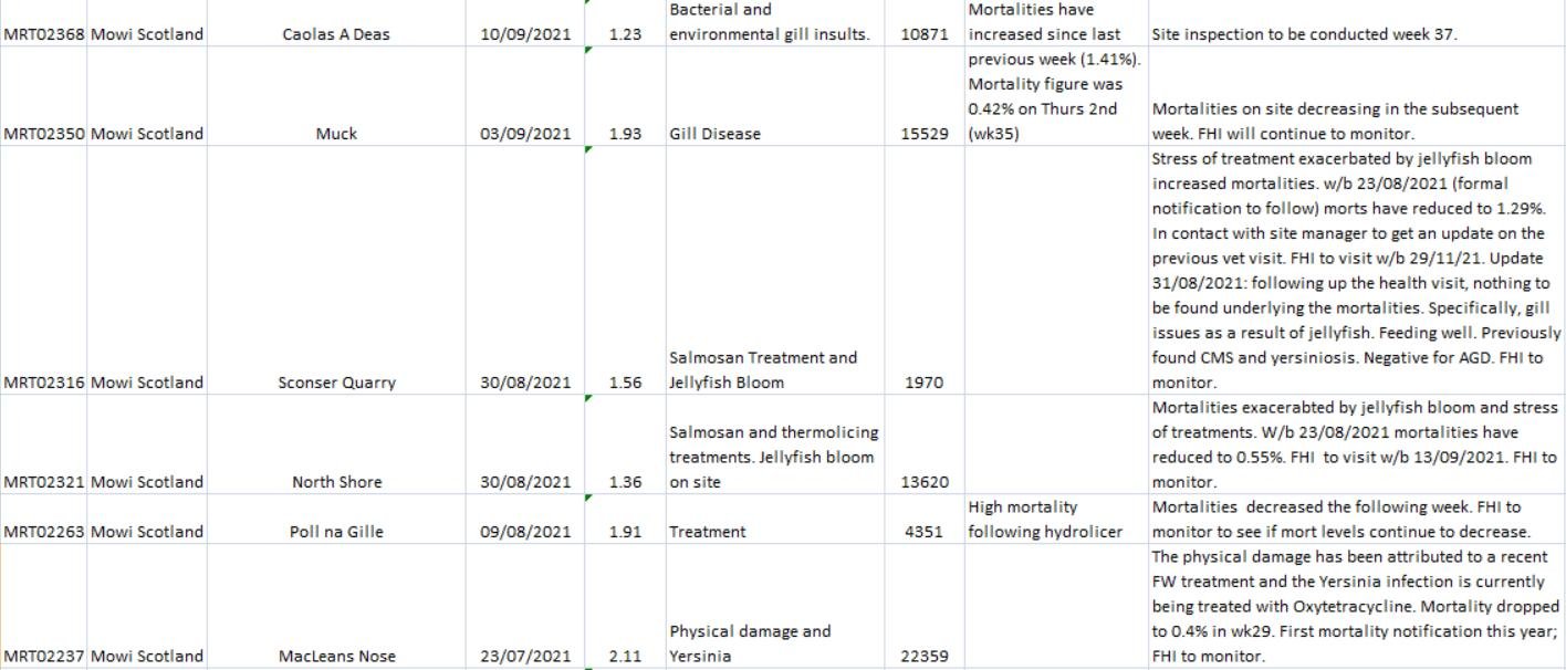 Mortality data published online by the Scottish Government details 6.6 million mortalities reported via 359 'Mortality Event Reports' from Mowi alone between January 2019 and 11 October 2021 – including multiple cases involving toxic chemicals and antibiotics at sites already certified as "responsibly farmed" via the Aquaculture Stewardship Council or undergoing 'Initial Audit':