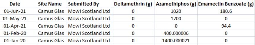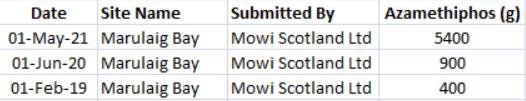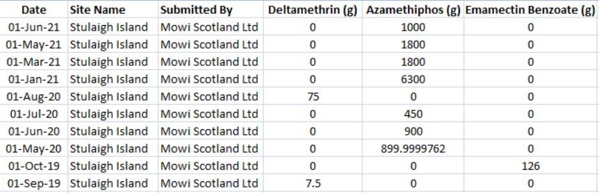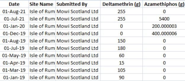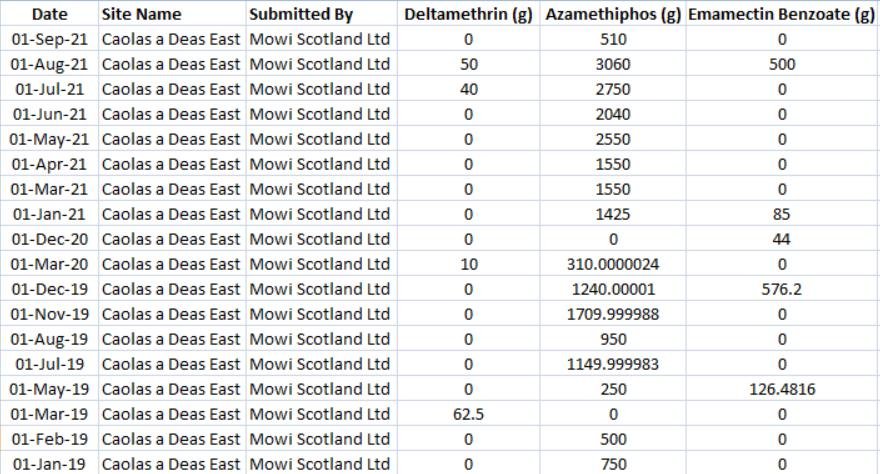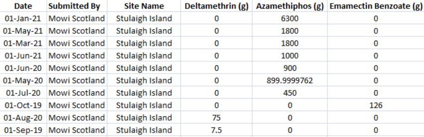 Mowi's Caolas a Deas East salmon farm in Loch Shell has used more double the amount of Azamethiphos, Deltamethrin and Emamectin benzoate in the first nine months of 2021 than in the whole of 2020 and 2019 combined!