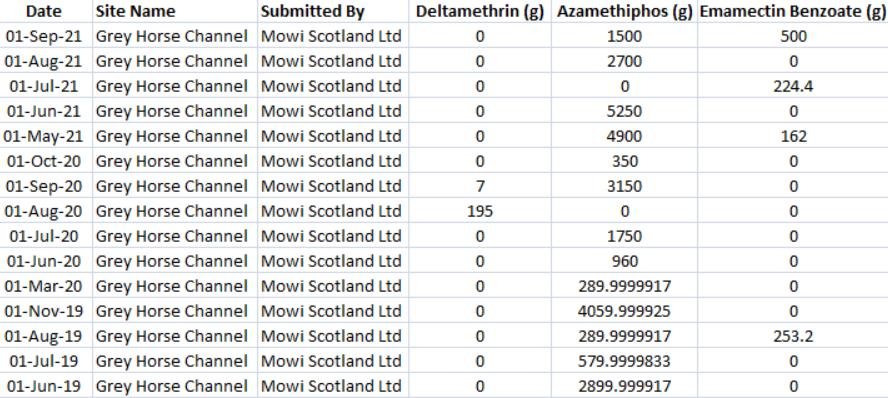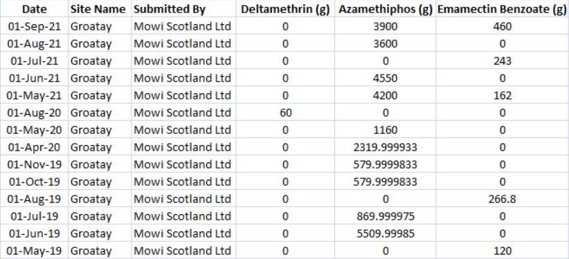 Mowi's Groatay salmon farm reported another dose of Emamectin benzoate in July 2021; another dose of Azamethiphos in August 2021 and doses of both Azamethiphos and Emamectin benzoate in September 2021.