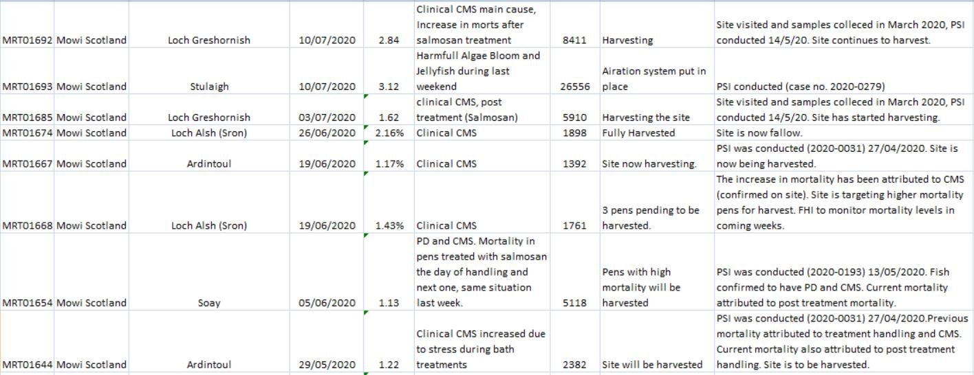 The latest salmon farm to be assessed by SEPA in terms of environmental monitoring surveys was in September 2020 with several Mowi salmon farms (including ASC-certified MacLeans Nose) surveyed in 2020 still "to be evaluated":