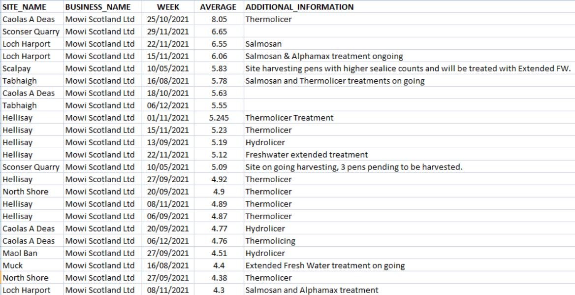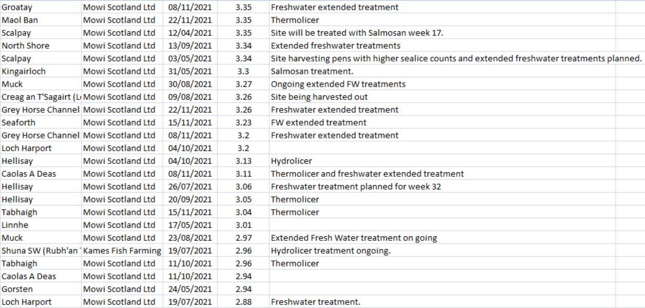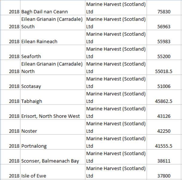 According to the Scottish Government's lice data (published online here), there were 69 cases of Mowi breaching 1 lice per fish at ASC-certified salmon farms (Linnhe, Leven, Marulaig Bay, Stulaigh, Gorsten, Harport, Rum and Invasion Bay) and salmon farms currently being audited by the ASC (Caolas a Deas West and East, Camus Glas, Alsh, Groatay, Grey Horse Channel, Duich, Greanem and Ardintoul). Here's the worst 40: