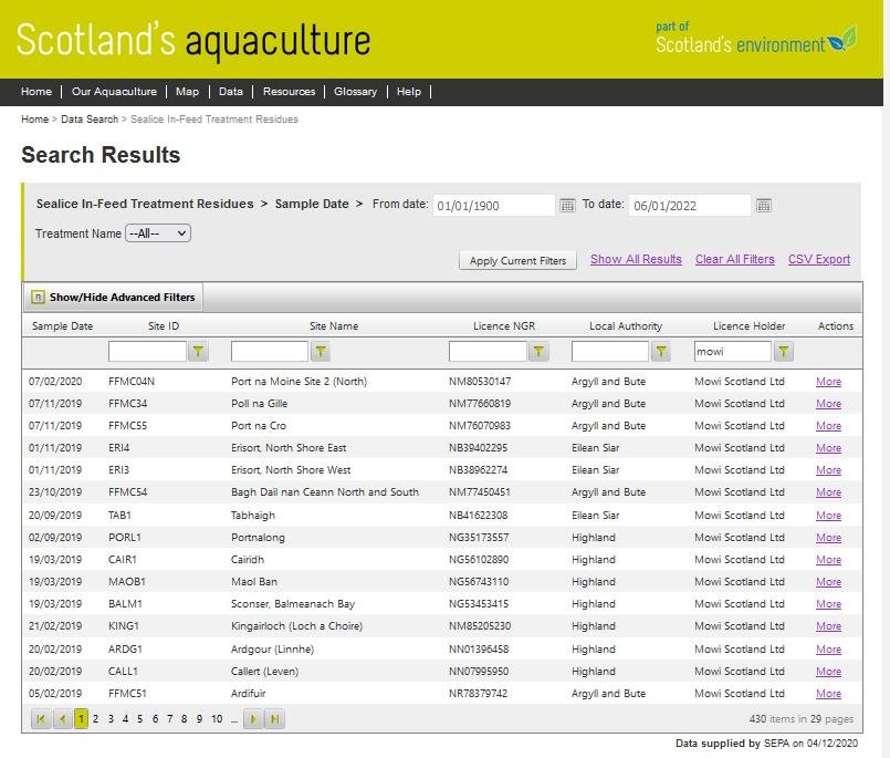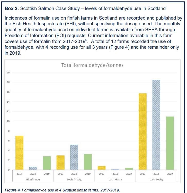 Site specific data on the carcinogenic chemical Formaldehyde (Formalin) use is not published via Scotland's Aquaculture database and has only been made available via FOI. Scottish Salmon Watch reported in May 2020: