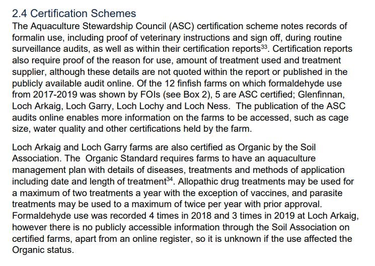 A report on Formaldehyde use in Scottish salmon farming published by Fidra in May 2021 included data on the use by Mowi at ASC-certified salmon farms in Loch Lochy, Loch Shiel (Glenfinnan), Loch Garry and Loch Arkaig: