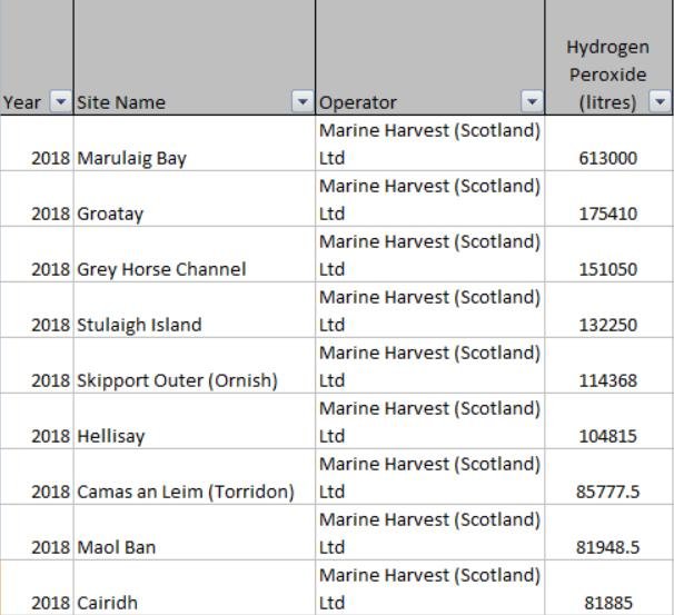 Another FOI disclosure by the Scottish Government in November 2019 (191018-HydrogenPeroxide-18) detailed use of Hydrogen peroxide in 2018 – here's Mowi salmon farms ranked in order of highest use (headed by Marulaig Bay which is certified as "responsibly farmed" by the ASC and followed by Groatay and Grey Horse Channel which are both undergoing an 'initial audit' for ASC certification):