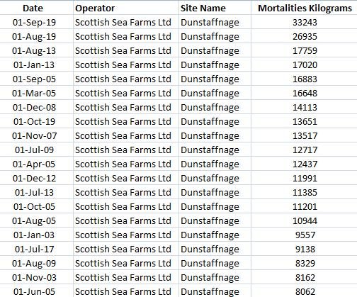Mass mortalities at the Dunstaffnage salmon farm operated by Norwegian-owned Scottish Sea Farms are staggering – here's the top 20 highest monthly mortalities as reported to SEPA.