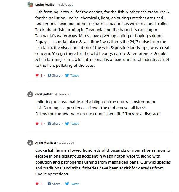 "Fish farming is a pestilence all over the globe," commented Chris Potter echoeing the sentiment of many people who have signed the petition.