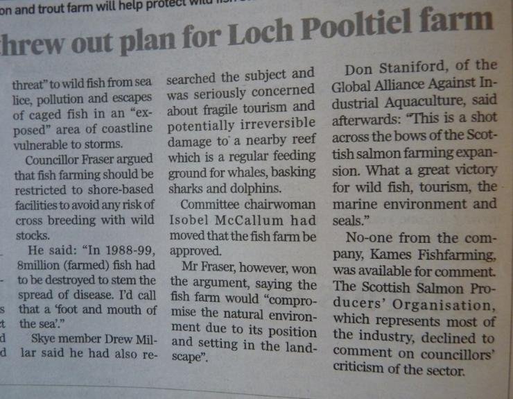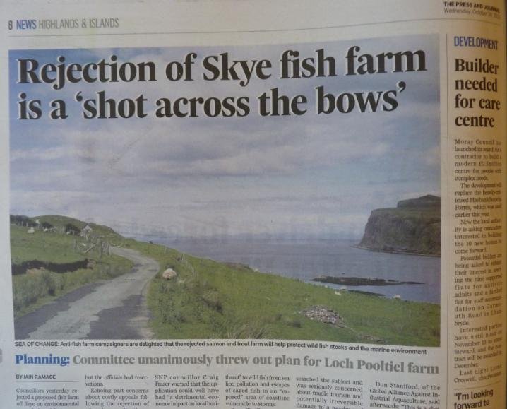 P&J: “Rejection of Skye fish farm is a ‘shot across the bows'” October 28, 2015 Here's the Press & Journal reporting on a famous victory against salmon farming expansion on the Isle of Skye: