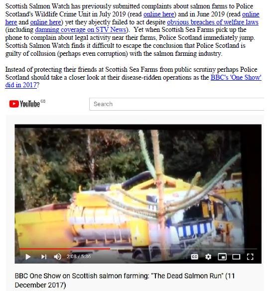 If Police Scotland investigated Scottish Sea Farms instead of the public for daring to safely venture close to their salmon farms (which operate in public waters – and in the case of Loch Creran, a Special Area of Conservation supposedly protected by law) then they would uncover a disease-ridden welfare nightmare – as the BBC 'One Show' discovered when they filmed at Scottish Sea Farms in 2017.