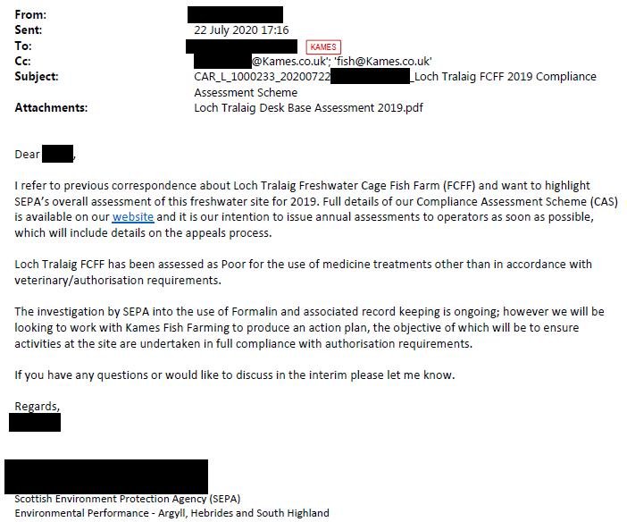 Documents obtained by Scottish Salmon Watch via Freedom of Information reveal that SEPA wrote to Kames in July 2020 informing the company (whose shareholders include the family of Viscount Selby) of the poor assessment "for the use of medicine treatments other than in accordance with veterinary/authorisation requirements". "The investigation by SEPA into the use of Formalin and associated record keeping is ongoing," wrote SEPA.