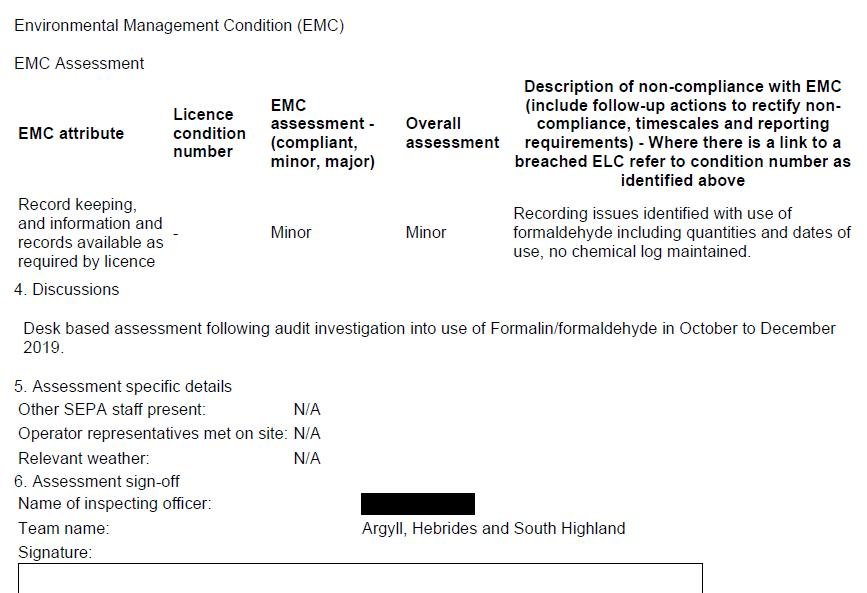 SEPA's 'Poor' compliance assessment of Kames detailed a "significant" non-compliance in relation to "repeat use of Formalin (Formaldehyde) to treat saprolegnia from October to December 2019 other than in accordance with the current version of the manufacturer's guidance, or as prescribed by a qualified veterinary surgeon". "Recording issues identified with the use of Formaldehyde including quantities and dates of use, no chemical log maintained," continued SEPA's compliance assessment report dated July 2020.