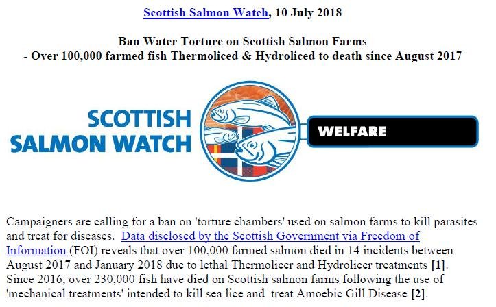 Press Release: “Ban Water Torture on Scottish Salmon Farms” July 10, 2018 Read press release in full online here (PDF version) and online here (Word version)