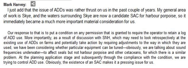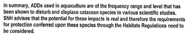 Documents obtained from the Scottish Government via FOI in March 2018 reveal that in July 2017 SNH advised the Scottish Government that the use of ADDs by salmon farms "can cause disturbance and displacement of cetaceans" and that "there is sound, scientific evidence to expect that hearing damage, stress and masking may also occur".  "Accordingly, we believe there to be a strong case for managing ADD deployment and use," advised SNH [3].