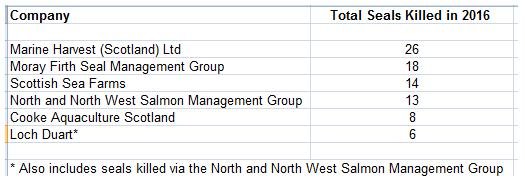 According to the latest seal-killing data published online by the Scottish Government, Marine Harvest killed 26 out of the 98 seals reported as killed in 2016 (more than any other company).  A total of 15 Marine Harvest salmon farms reported seal kills including sites in Loch Ewe, Torridon, Greshornish, Linnhe, Colonsay, and Lochalsh – that represents 30% of Marine Harvest Scotland's 49 salmon farms killing seals.