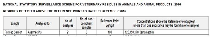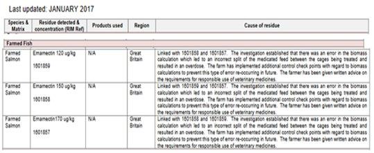 Testing by the VMD published in December 2016 revealed three breaches of the Maximum Residue Limit (MRL) for Emamectin in farmed salmon.
