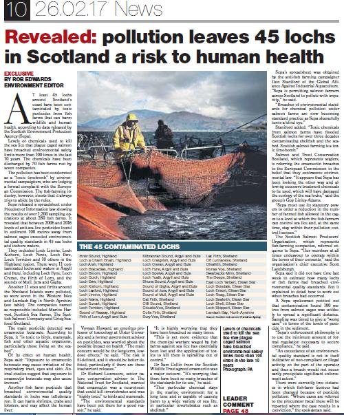 In February 2017, The Sunday Herald revealed toxic chemical pollution of 45 lochs around Scotland – including over 100 cases of Emamectin contamination [4] – was "a risk to human health".