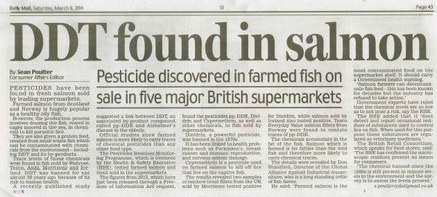 In 2014, The Daily Mail revealed contamination of farmed salmon with DDT, Dieldrin and Cypermethrin.