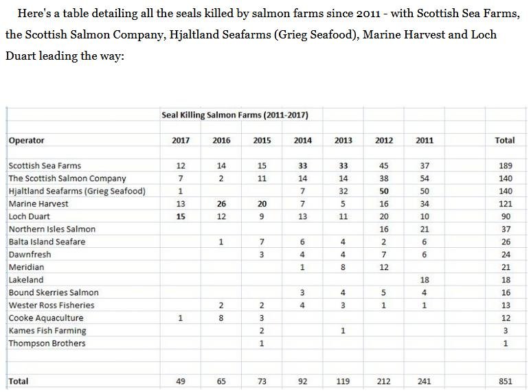 The "fatal results" of Scottish Sea Farms can also be seen in published data on seals killed – with Scottish Sea Farms named and shamed as Scottish salmon's #1 seal killer.