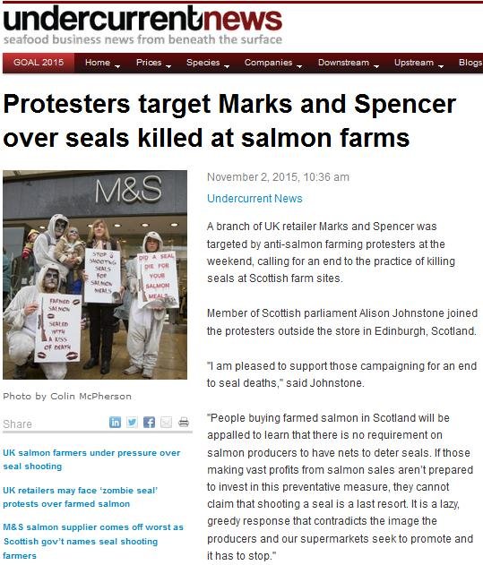 On Friday (30 October) in Edinburgh, Marks & Spencer supermarket found itself caught in the cross-fire over the killing of seals by salmon farms. Protestors took to Princes Street to urge shoppers to boycott salmon sourced from salmon farms which kill seals.