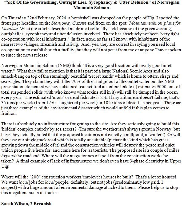 Norwegian Mountain Salmon's plans were lambasted as an "environmental disaster" and "megalomania" by Sarah Wilson who lives in Breanish (the village closest to the proposed development):
