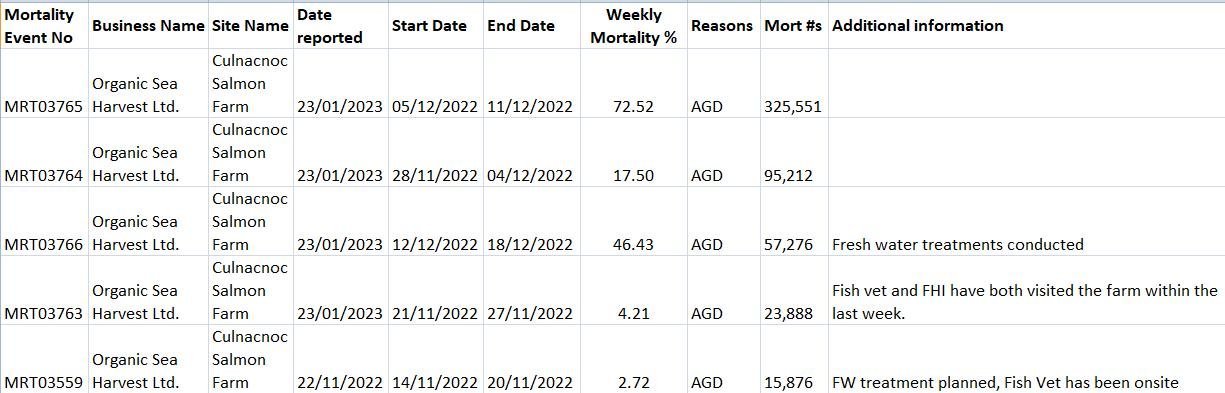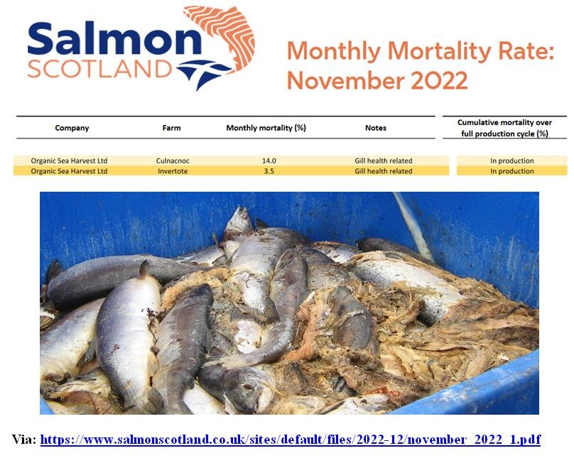 Salmon Scotland's mortality data – published online monthly – details a 47.9% mortality rate at Organic Sea Harvest's Culnacnoc salmon farm for December 2022: