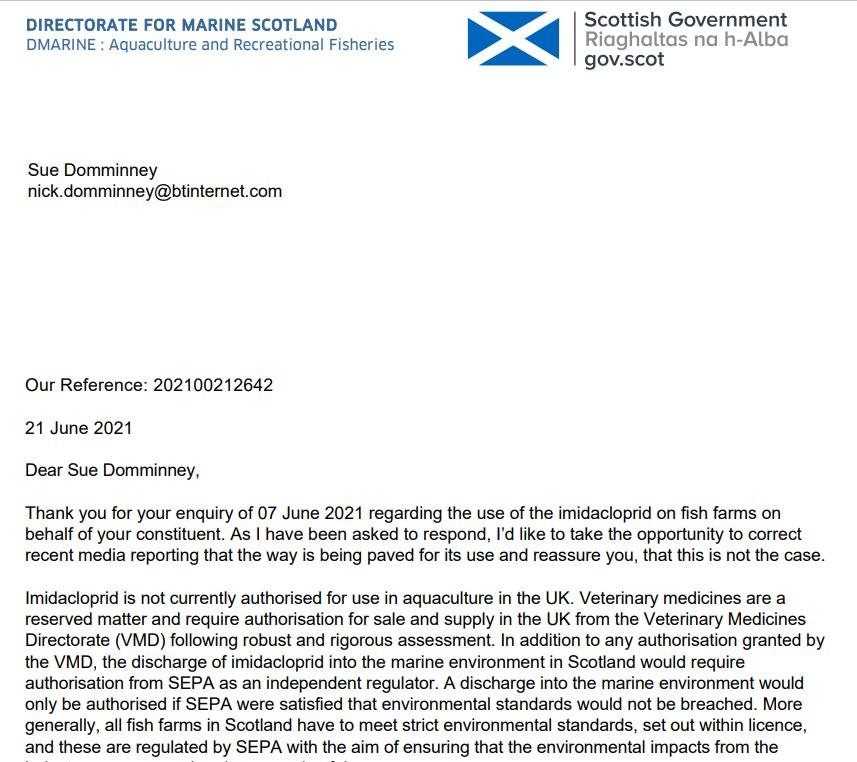 - FOI letter on Scientific Concerns re. Imidacloprid Use in Scottish Salmon Farming