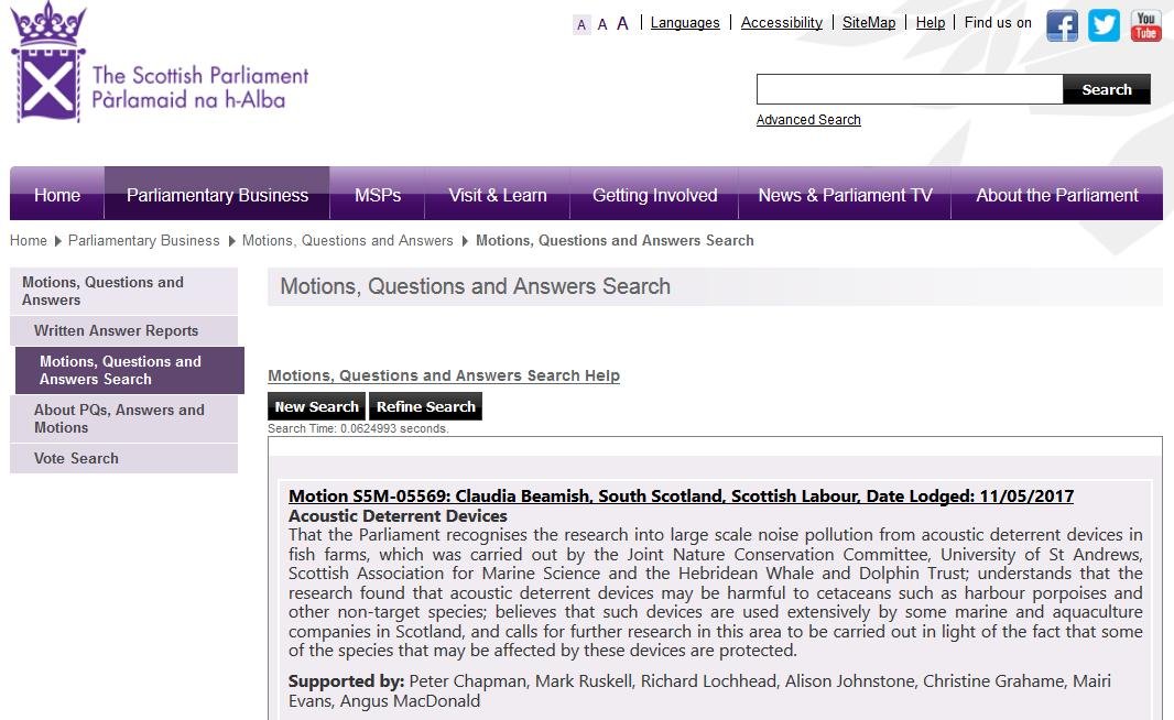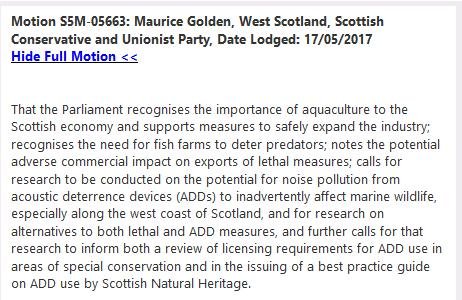 Scottish Parliament Motions on Acoustic Deterrent Devices May 22, 2017 Here's two motions filed by Members of the Scottish Parliament – one by Claudia Beamish MSP: And a second filed by Maurice Golden MSP: Read more via: Press Release: "Cetaceans Sound Alarm On Salmon Farms – new research sparks EC complaint & call to ban Acoustic Deterrent Devices" Sunday Herald: "Health of whales, dolphins and porpoises put at risk by underwater alarms"