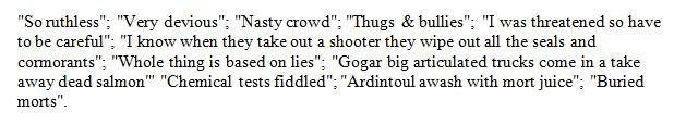 Scottish Salmon Watch visited Ardintoul following a tip-off from a whistleblower who claimed that the area was a graveyard for the corpses of diseased farmed salmon and was "awash with mort juice".