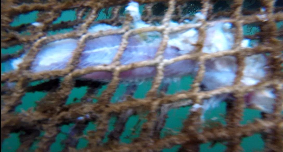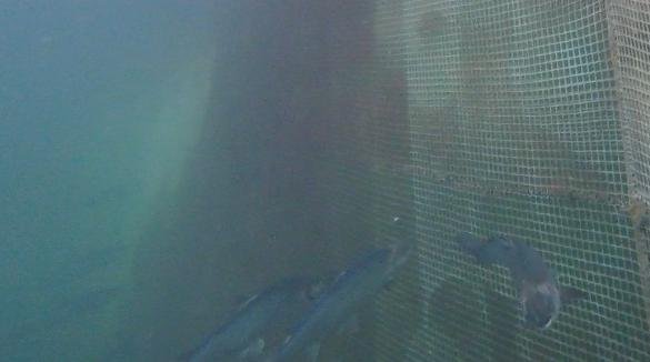 From the surface of the cage there appeared to be what looked like the carcass of a dead farmed salmon trapped in the net.