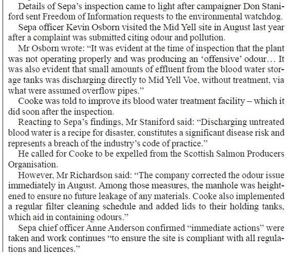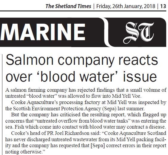 Shetland Times: “Salmon company reacts over ‘blood water’ issue” January 26, 2018 The Shetland Times reported (26 January 2018): Download as a PDF Download Shetland Times 26 Jan 2018 Read more via: Press Release: "Cooke's Untreated Blood Water is 'Gross' says SEPA" BBC Radio Shetland on Cooke's "untreated blood water" in Scotland BBC News: "Shetland salmon packing factory leaks 'blood water' into sea"