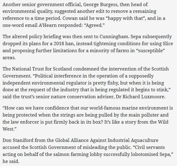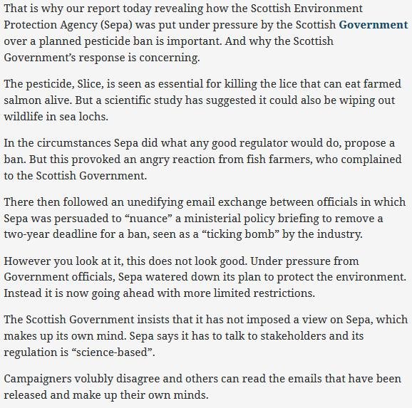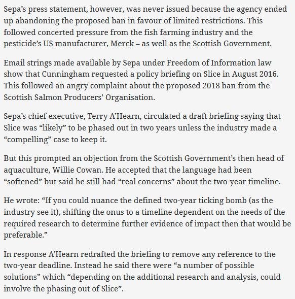 Terry A'Hearn's private meetings and dinners with the Salmafia paid off in August 2016 when SEPA was poised to issue a media release announcing a ban on the shellfish-killing chemical Emamectin benzoate (SLICE).    Emails disclosed via FOI reveal how intense lobbying by the 'Scottish' salmon farming industry, the chemical giant Merck and their fishy friends inside the Scottish Government forced SEPA into a u-turn with Terry A'Hearn making key policy decisions to stave off a ban:
