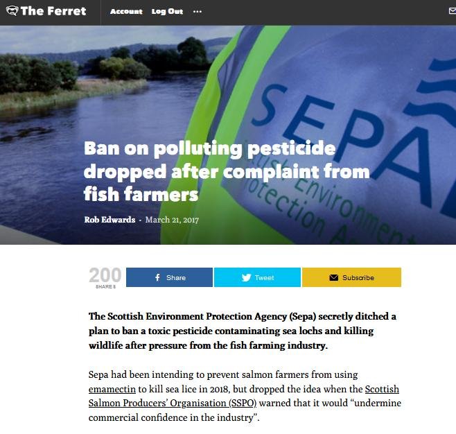 So instead of banning SLICE (Emamectin benzoate), SEPA not only refrained from issuing a media release announcing a ban but they also buried the Scottish Aquaculture Research Forum report!    The Ferret reported in March 2017: