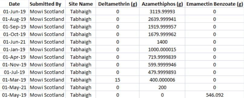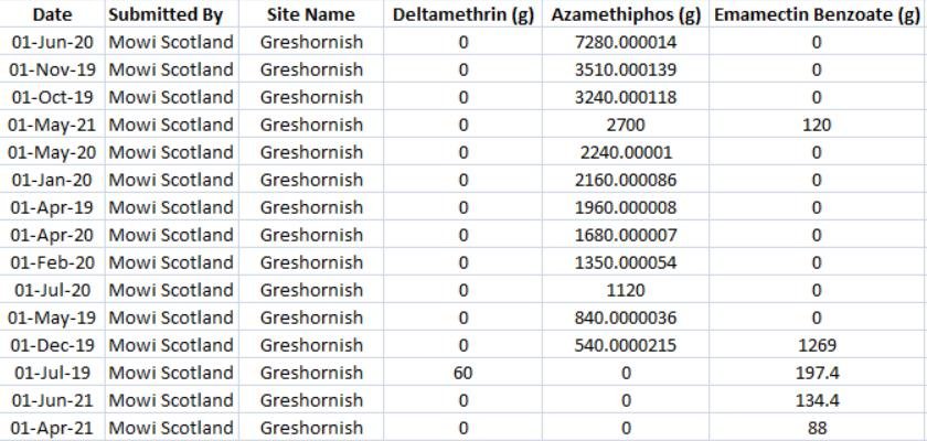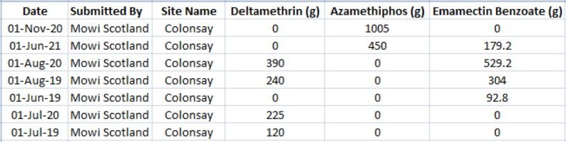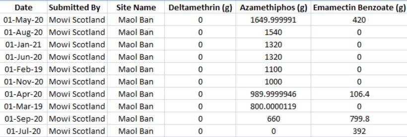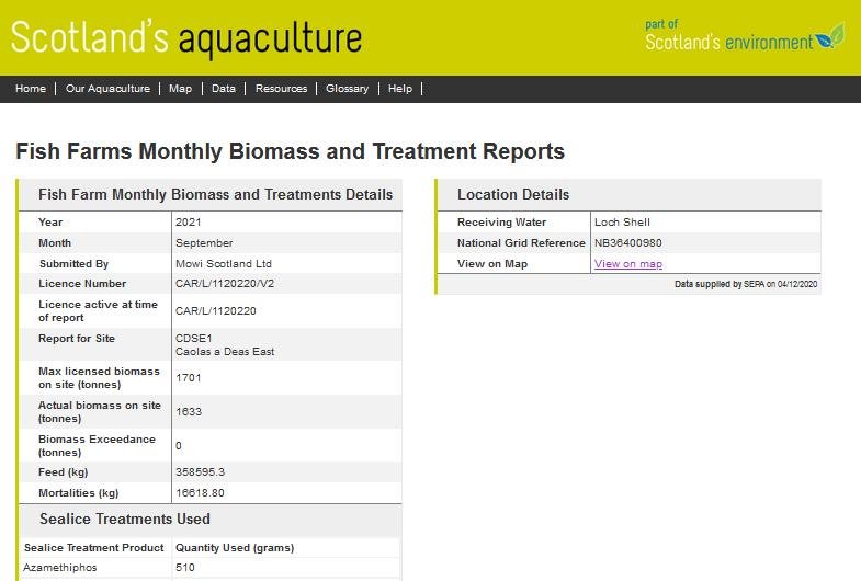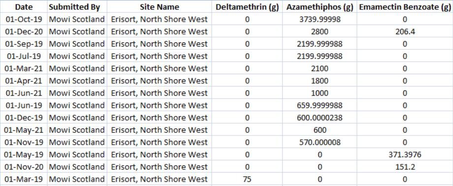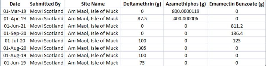 Mowi's Groatay salmon farm reported another dose of Emamectin benzoate in July 2021; another dose of Azamethiphos in August 2021 and doses of both Azamethiphos and Emamectin benzoate in September 2021.