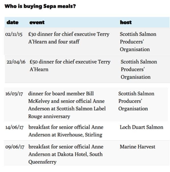 In December 2017, The Ferret reported how SEPA "has been repeatedly wined and dined by the fish farming, whisky and power industries, prompting questions to be raised about its impartiality" including two dinners involving Terry A'Hearn and the salmon farming lobby.