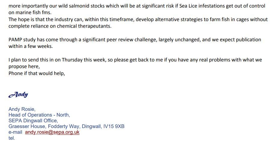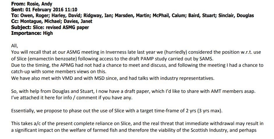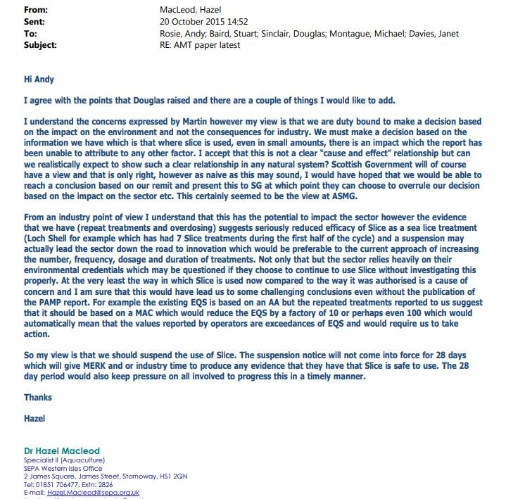 As scientific context, SEPA's aquaculture specialist Douglas Sinclair had recommended in a 'SEPA Response Options Paper' circulated internally earlier in 2016 that SLICE be banned and other sea lice chemicals (e.g. Deltamethrin and Azamethiphos) be restricted to "one use per growth cycle":