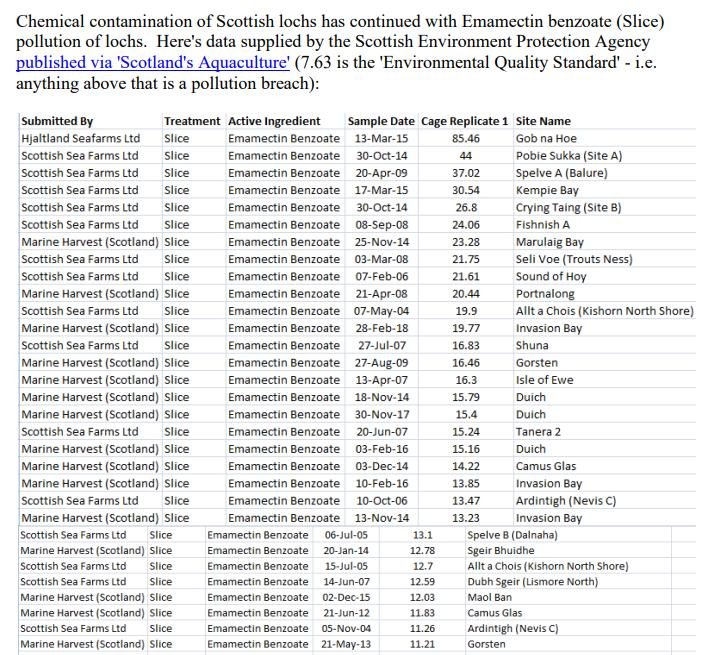 Emamectin contamination of Scottish farmed salmon has now occurred at least eight times with other cases reported by the VMD in 2012 (Scottish Salmon Company), 2010 (Lakeland Marine), 2009 (Skelda Salmon), 2006 (Scottish Sea Farms) and 2005 (Marine Harvest).