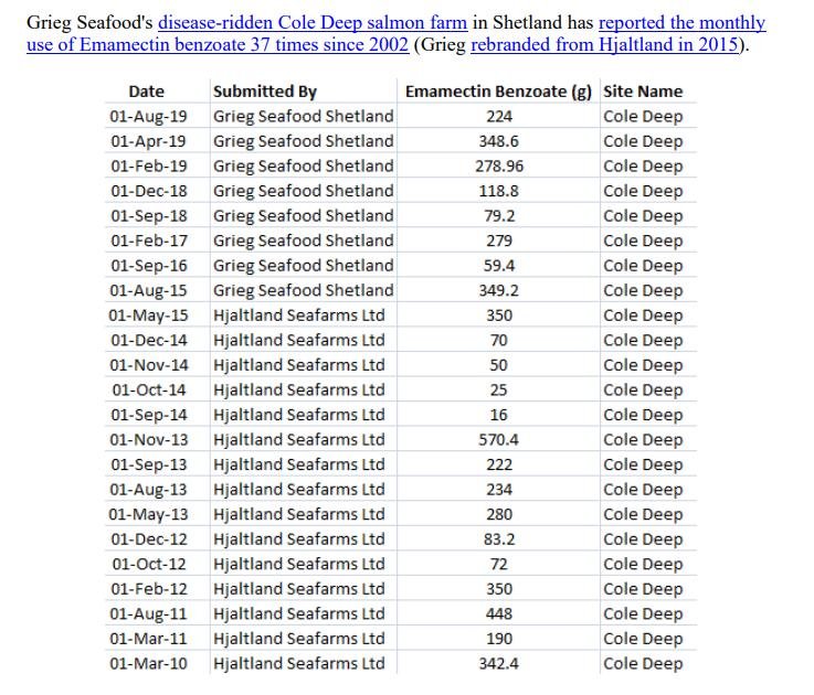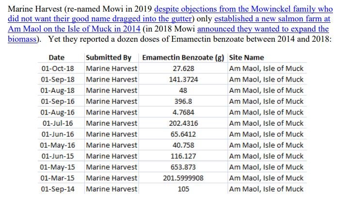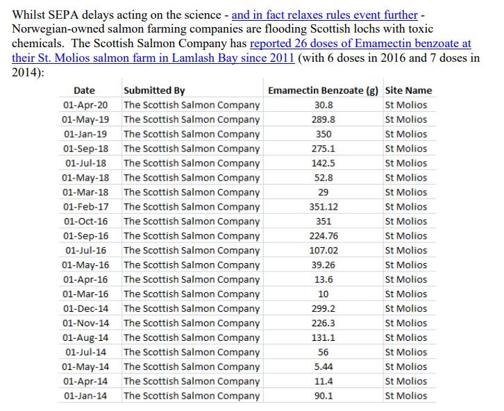 This is not the first time The Scottish Salmon Company has been caught out overdosing on Emamectin benzoate in Loch Roag.  The Daily Mail reported in March 2017: