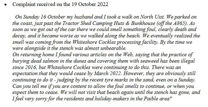 On returning home I found various articles on the Web, saying that the practice of burying dead salmon in the dunes and covering them with seaweed has been illegal since 2016, but Whiteshore Cockles were continuing to do this. There was an expectation that they would cease by March 2022. However, they are obviously still continuing to do it – judging by the recent tyre marks in the sand, even on a Sunday. Can you tell me if you are content to allow the foul smells to continue, or when you expect them to cease. We will not visit that beach again until the stench has gone, and I feel very sorry for the residents and holiday-makers in the Paible area”