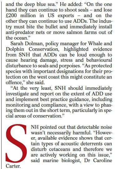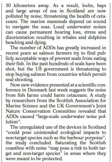 Sunday Herald: “Health of whales, dolphins and porpoises put at risk by underwater alarms” May 7, 2017 The Sunday Herald reported (7 May 2017): Here's the newspaper version – download as a PDF online here Read more via: Press Release: "Cetaceans Sound Alarm On Salmon Farms – new research sparks EC complaint & call to ban Acoustic Deterrent Devices"