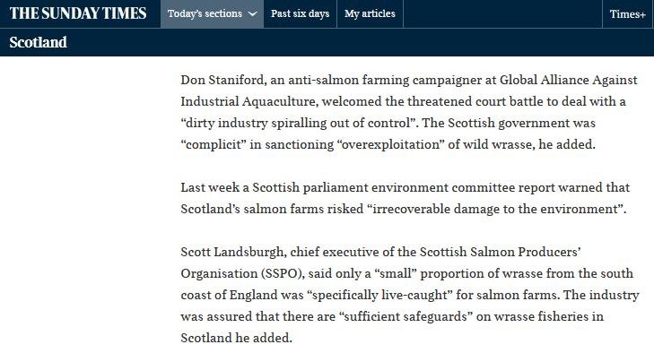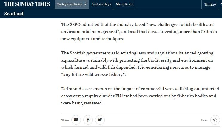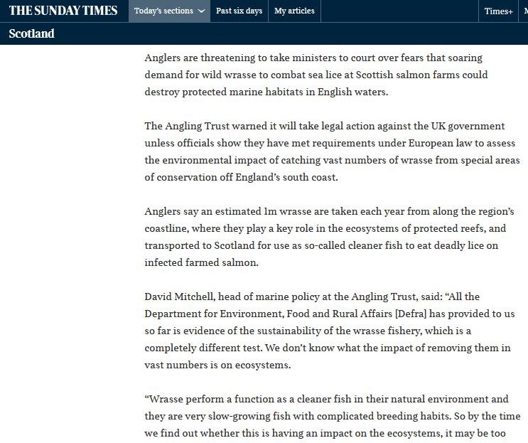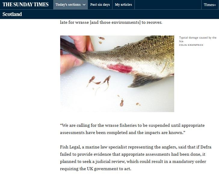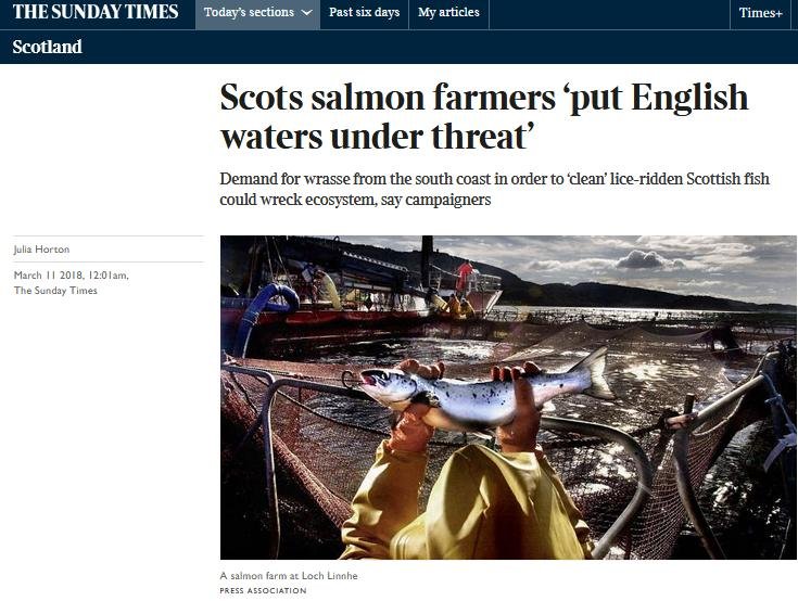 Sunday Times: “Scots salmon farmers ‘put English waters under threat’” March 11, 2018 The Sunday Times reported (11 March 2018): Read more via: "Legal action looms over reef wrasse removals" Sunday Times: "‘Clean fish’ bring danger of disease to salmon farms" "Cleaning up the 'cleaner fish'" "Wrasse exploitation: Fish Legal raises concerns with Defra on behalf of Angling Trust" Sunday Times: "Lice-eating fish from Devon sent to clean Scots salmon" The Guardian: "Salmon farmers ‘put wild fish at risk’ in fight to kill off sea lice" BBC News: "Scottish Salmon farming 'risk' to wild wrasse" New Scientist: "Cleaner fish that keep farmed salmon healthy at risk of wipe-out"