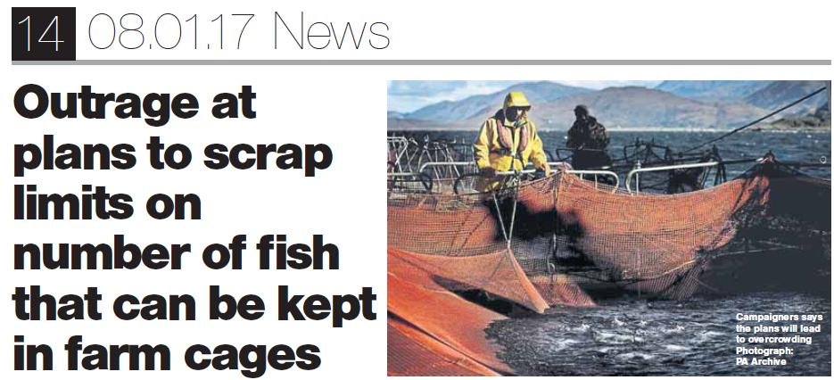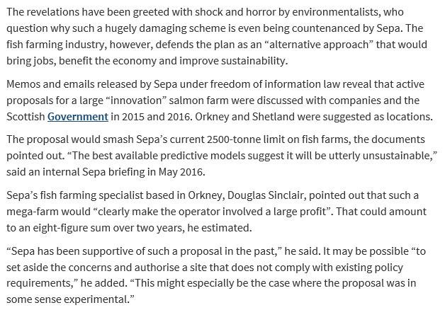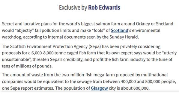 Exclusive documents obtained from the Scottish Environment Protection Agency (SEPA) reveal secret plans to expand Scotland's salmon farming industry – including proposals for super-sized salmon farms producing up to 8,000 tonnes of farmed salmon.  Today's Sunday Herald reports: "Outrage over secret plans to base world's biggest salmon farm in Scotland".