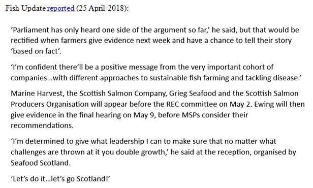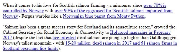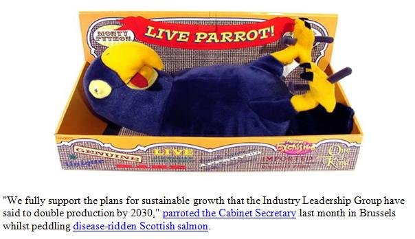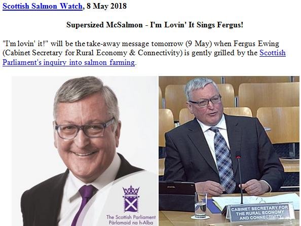 Supersized McSalmon – I’m Lovin’ It Sings Fergus! May 8, 2018 Download in full as a PDF online here (and as a Word document online here). Read more on supersized salmon farming via: Big McSalmon, Large Lice & Toxic Chemicals – Supersized Salmon Goes Global! Sunday Times: "Supersizing salmon farms in Scotland 'will be a disaster’" SEPA proposes lifting biomass cap for Scottish salmon farms Industry: no imminent plans for super-sized salmon farm Outrage over secret plans to base world's biggest salmon farm in Scotland Super-sized Scottish Salmon – 8,000 tonnes of trouble on the horizon! Opposition mounts to super-sized fish farm in Galway Bay