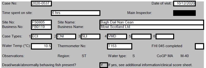 Data recently published by the Scottish Government's Fish Health Inspectorate reveals damning 'Case Information' on infectious diseases, mass mortalities and toxic chemicals are salmon farms across Scotland in November and December 2020: