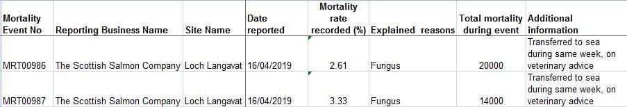 The Fish Health Inspectorate's mortality data records two 'Mortality Event Reports' at The Scottish Salmon Company's Loch Langavat site with 34,000 dead farmed salmon due to fungus (shockingly it seems other farmed salmon infected with fungus were "transferred to sea during same week, on veterinary advice".