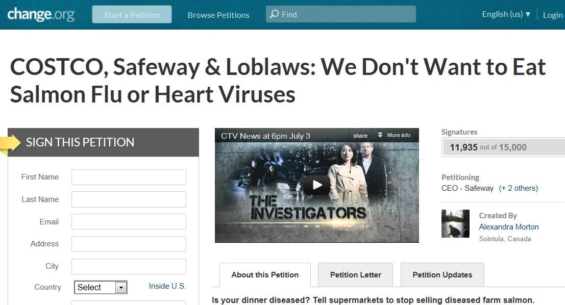 Salmon farming is now so disease-ridden that consumers are being urged to boycott farmed salmon. Join the 12,000 people who have signed a petition to supermarkets calling for an end to diseased farmed salmon.