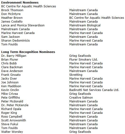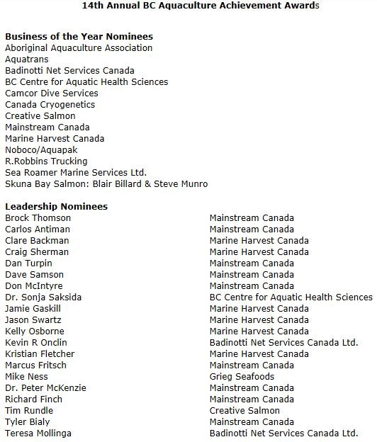 Later this evening, the 14th Annual BC Aquaculture Achievement Awards take place in Campbell River. Nominees include a smorgasbord of Norwegian-owned salmon farming companies: